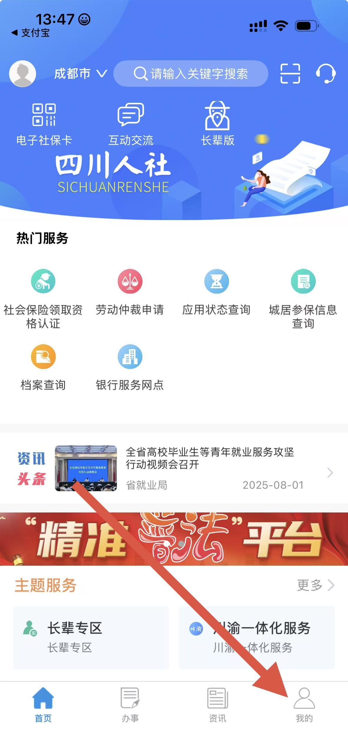 1、打開(kāi)四川人社APP,點(diǎn)擊底部導(dǎo)航欄我的進(jìn)入個(gè)人界面。
