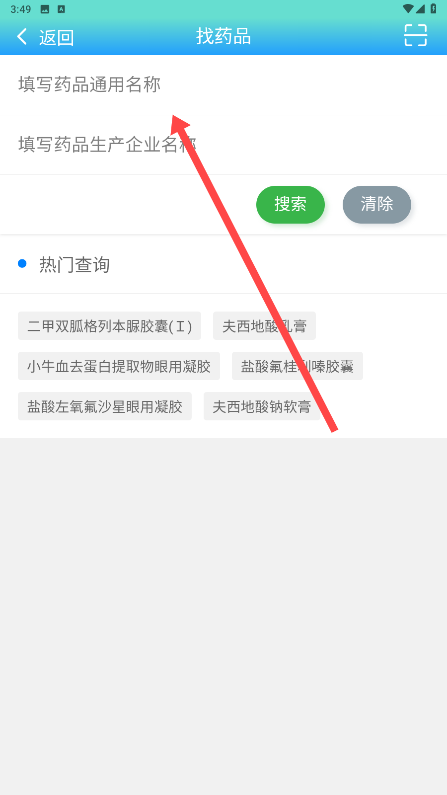 2、進入找藥界面后,顯示填寫藥品通用名稱和填寫藥品生產(chǎn)企業(yè)名稱兩個輸入框,你可以根據(jù)實際需求,或填寫藥品生產(chǎn)企業(yè)名稱來更精準地查找。