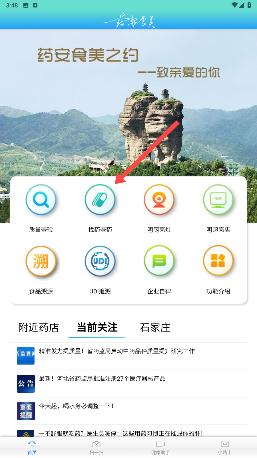 1、打開藥安食美APP,進入到首頁界面,在首頁中,能看到各種功能圖標,如質(zhì)量查驗、找藥查藥、明廚亮灶等,點擊找藥查藥功能。