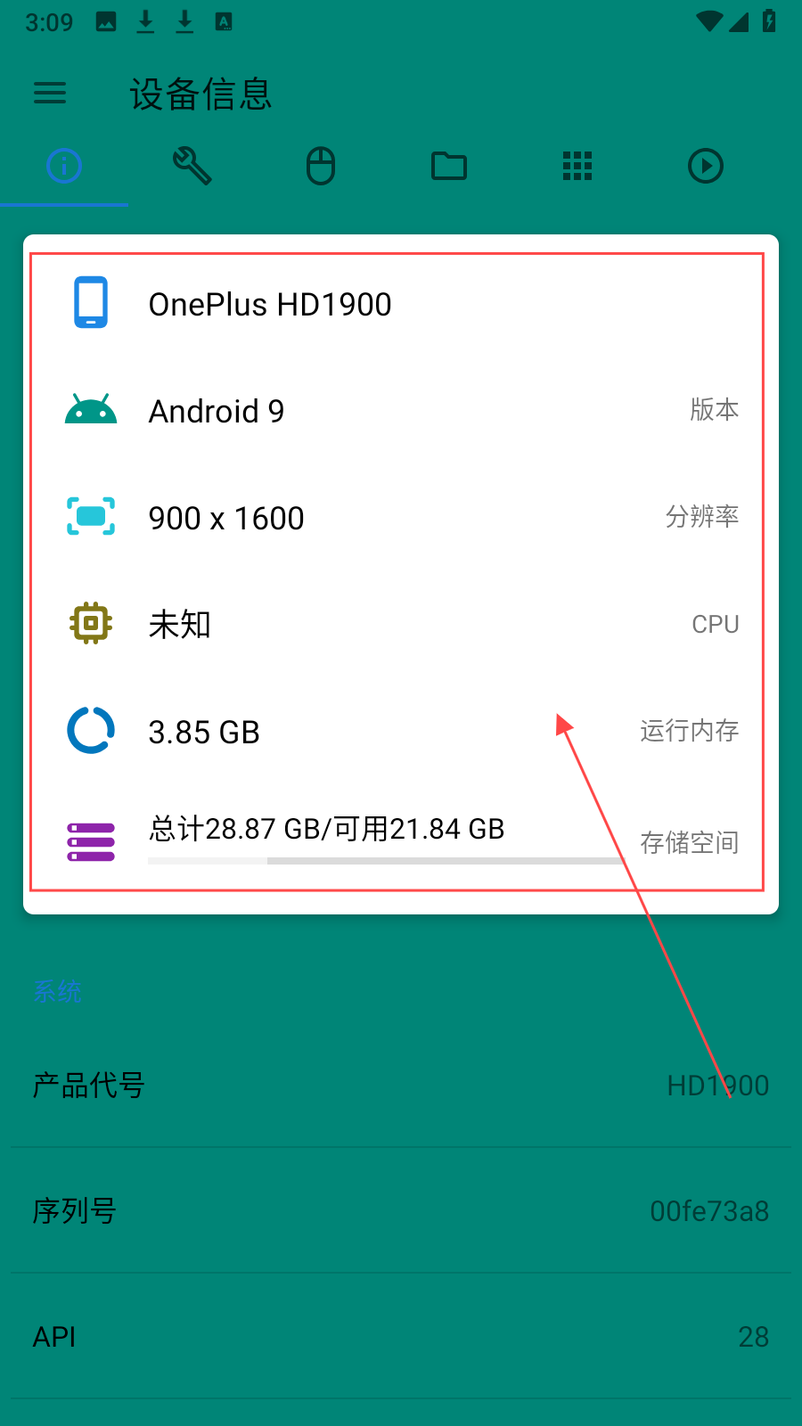 1、打開(kāi)甲殼蟲(chóng)adb助手進(jìn)入設(shè)備信息頁(yè)面,可查看手機(jī)型號(hào)如OnePlus HD1900 ,安卓版本、分辨率、運(yùn)行內(nèi)存、存儲(chǔ)空間等設(shè)備基礎(chǔ)信息,了解設(shè)備當(dāng)前狀態(tài) 。