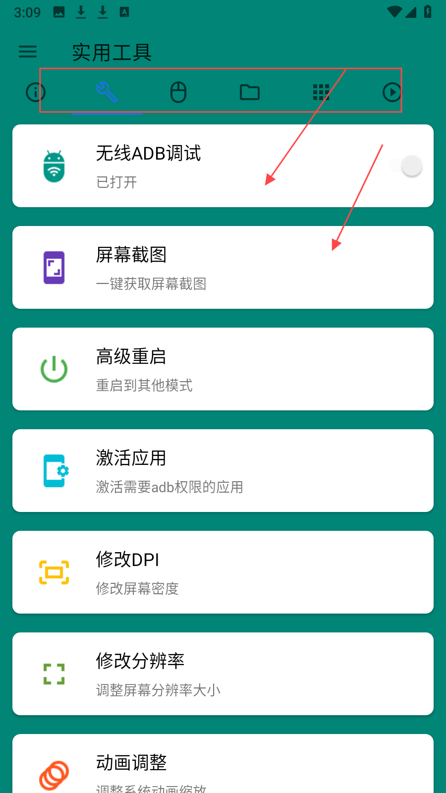 2、進(jìn)入實(shí)用工具界面有無(wú)線ADB調(diào)試、屏幕截圖、高級(jí)重啟、激活應(yīng)用、修改DPI、修改分辨率、動(dòng)畫(huà)調(diào)整等多種功能,根據(jù)需求點(diǎn)擊相應(yīng)功能按鈕進(jìn)行操作。