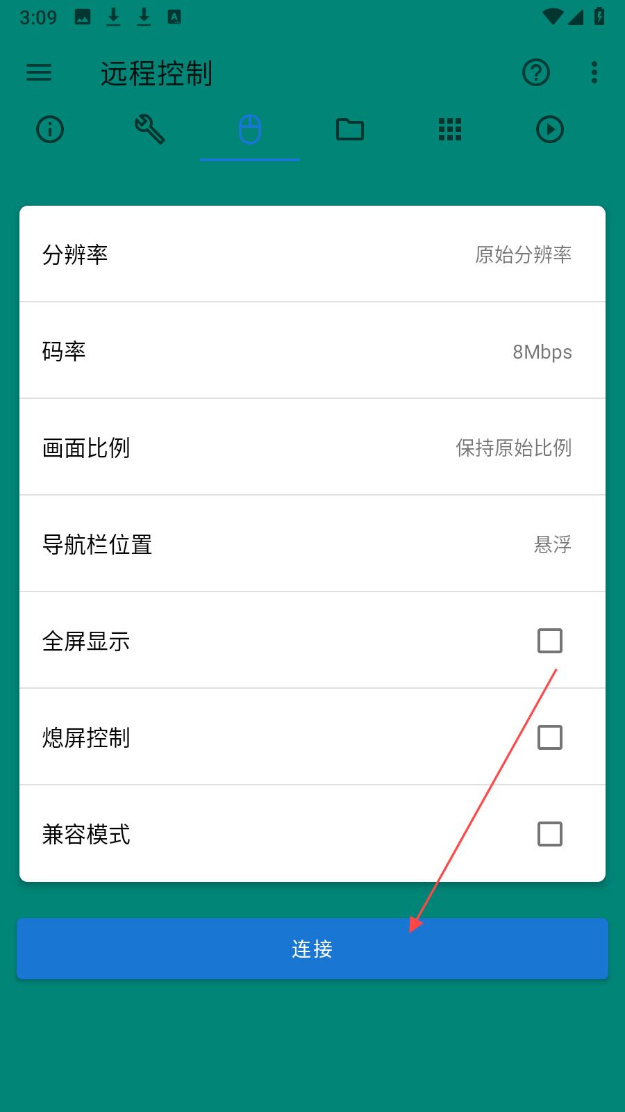 3、在遠(yuǎn)程控制頁(yè)面,設(shè)置分辨率、碼率、畫(huà)面比例、導(dǎo)航欄位置等參數(shù),設(shè)置完成后,點(diǎn)擊連接按鈕,即可嘗試遠(yuǎn)程連接設(shè)備進(jìn)行相關(guān)控制操作,實(shí)現(xiàn)對(duì)設(shè)備的遠(yuǎn)程管理 。