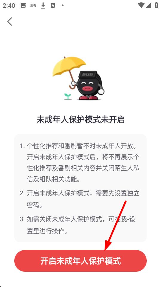 4、在未成年人保護(hù)模式介紹頁(yè)面,點(diǎn)擊開啟未成年人保護(hù)模式按鈕,按提示完成設(shè)置。