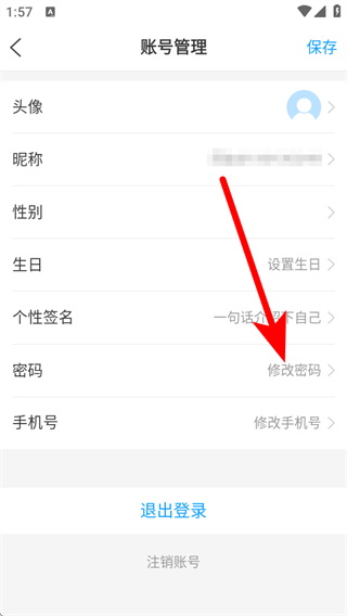 3、在賬號(hào)管理頁(yè)面,點(diǎn)擊密碼欄的修改密碼,進(jìn)入修改密碼頁(yè)面。