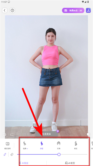 3、照片導(dǎo)入后,下方會出現(xiàn)頭發(fā)編輯選項,按需選擇并調(diào)整參數(shù),還能點擊生成發(fā)絲優(yōu)化。