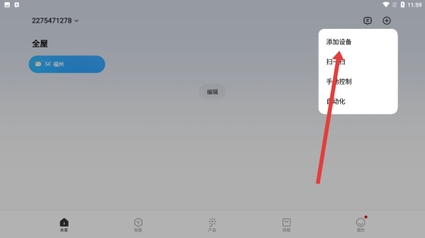 1、在米家主頁中,點擊右上角的添加設(shè)備按鈕,即可跳轉(zhuǎn)到添加設(shè)備頁面。