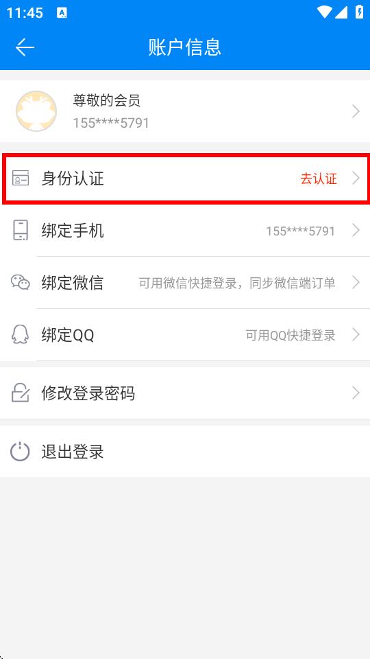 3、在賬戶信息界面中找到身份認證選項并點擊,進入身份認證頁面。