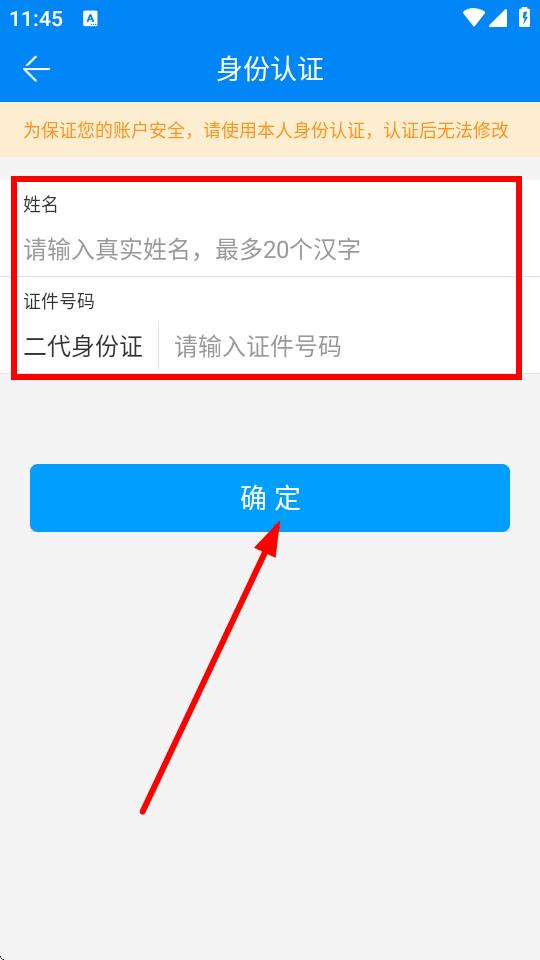 4、在身份認證頁面輸入真實姓名和二代身份證證件號碼,點擊確定即可完成身份認證。