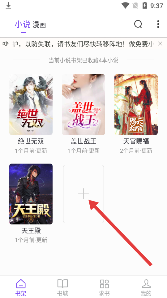 1、在書架頁(yè)點(diǎn)擊加號(hào)按鈕,可以添加新的小說(shuō)到我的書架。