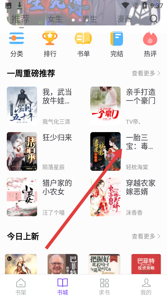 2、跳轉(zhuǎn)到書城頁(yè)之后,選擇心儀的小說(shuō),點(diǎn)擊封面進(jìn)入小說(shuō)詳情頁(yè)。