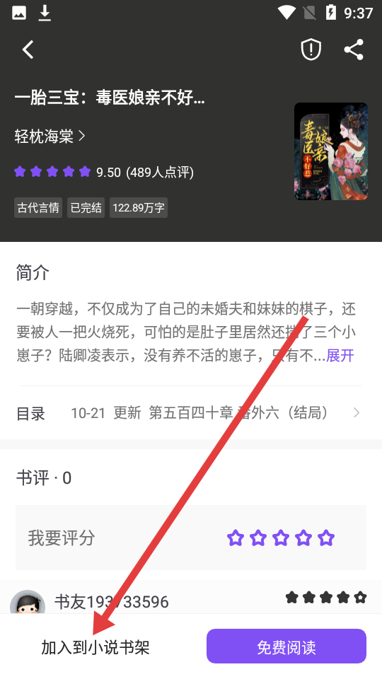 3、在小說(shuō)詳情頁(yè)面,找到左下角的加入到小說(shuō)書架按鍵,點(diǎn)擊完成添加小說(shuō)操作。