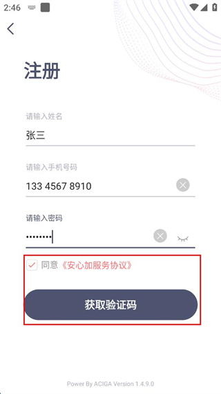 3、在注冊界面,輸入姓名、手機號碼、密碼,勾選同意服務協(xié)議。