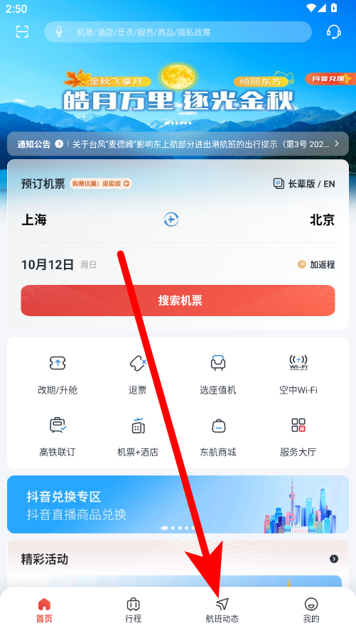 1、打開(kāi)東方航空App,點(diǎn)擊底部菜單欄中的航班動(dòng)態(tài)選項(xiàng)。