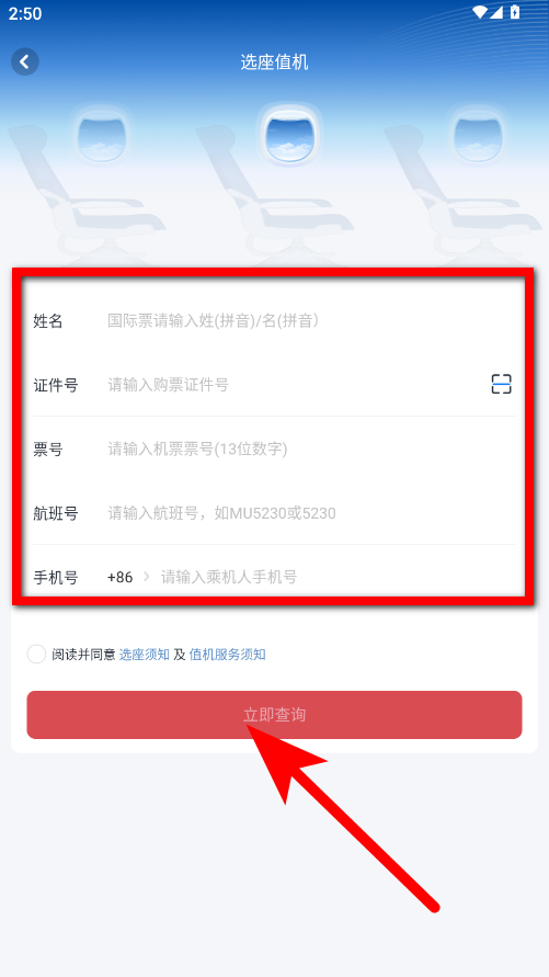3、在選座值機(jī)頁(yè)面,輸入相關(guān)信息,勾選同意后,點(diǎn)擊立即查詢,完成值機(jī)選座操作。