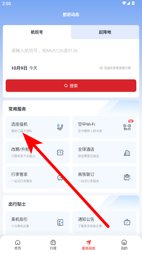 2、在航班動(dòng)態(tài)頁(yè)面,找到常用服務(wù)板塊,點(diǎn)擊其中的選座值機(jī)。