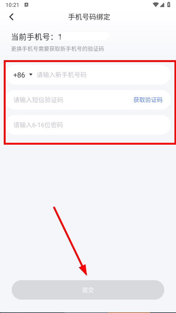 5、在頁面輸入新手機號,獲取并輸入短信驗證碼,再設(shè)置密碼后,點擊提交,即可完成手機號修改。