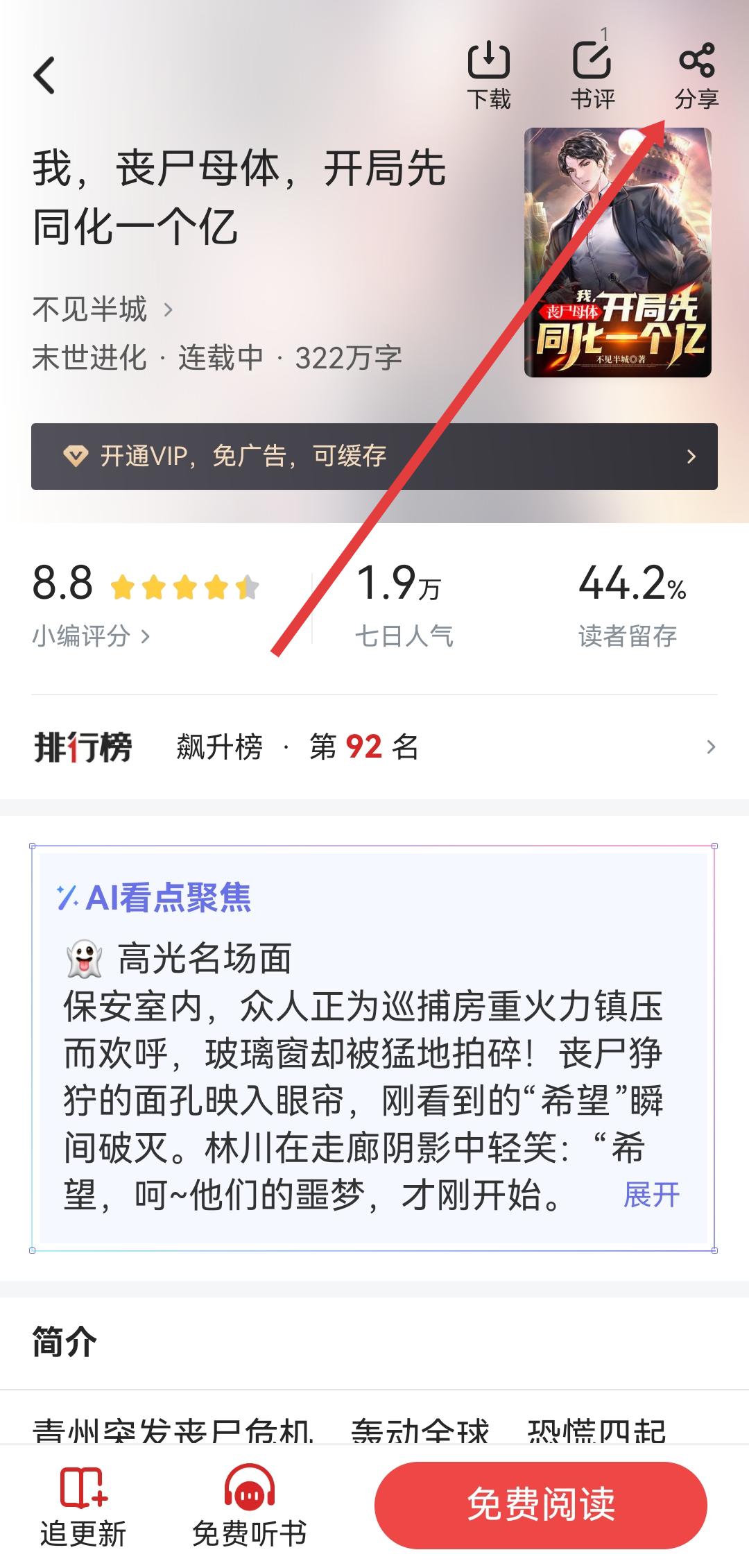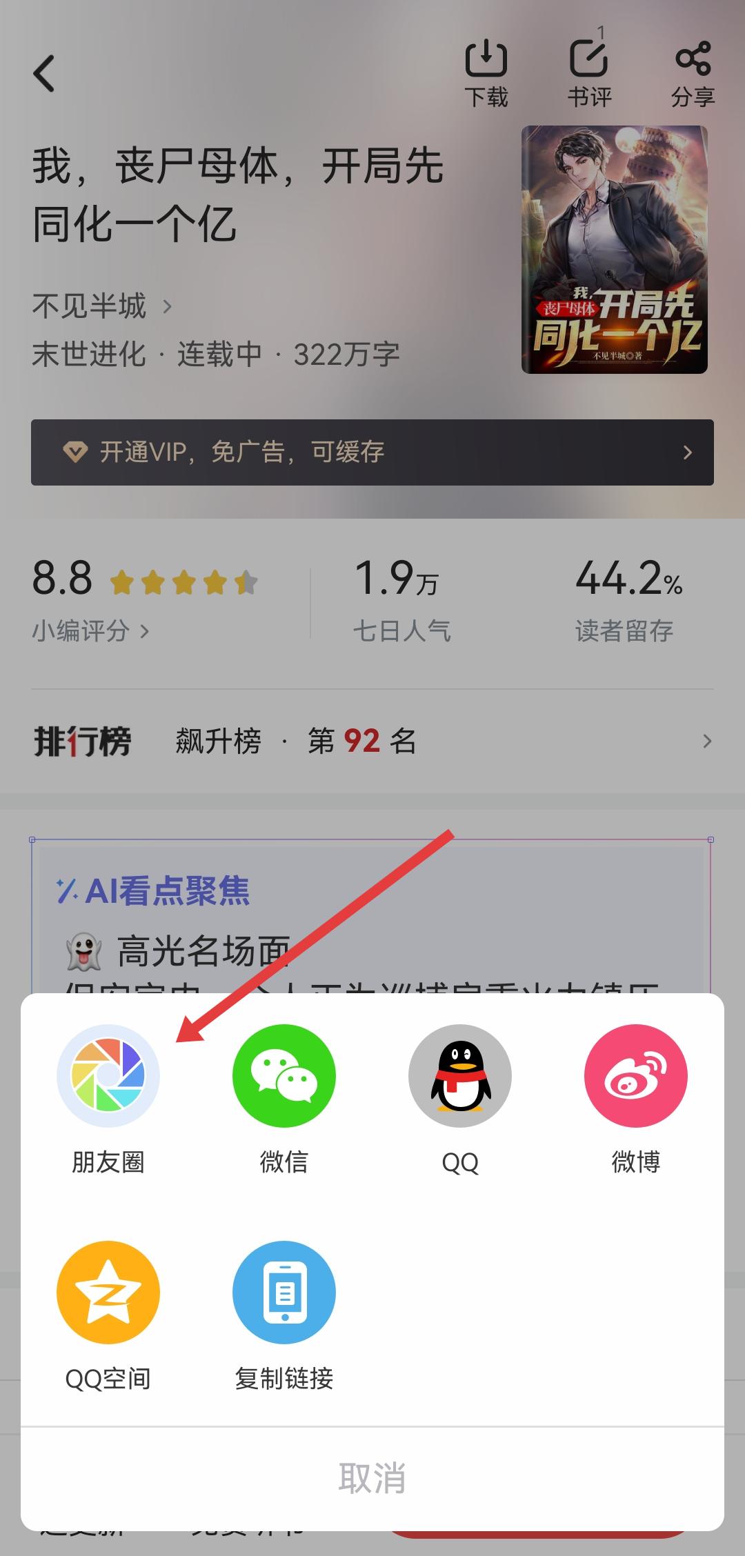 2、在書籍詳情頁面,點擊右上角的分享圖標,彈出分享選項列表。