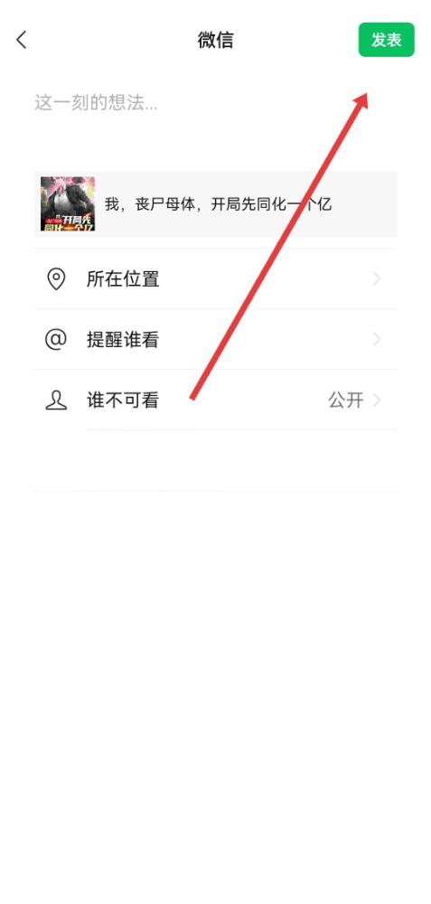 4、在微信朋友圈分享界面,然后點擊右上角發(fā)表按鈕,即可將書籍分享到朋友圈。