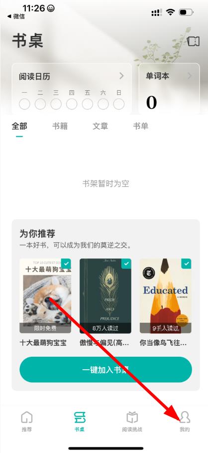 1、打開薄荷閱讀app進(jìn)入書桌頁面,點(diǎn)擊底部導(dǎo)航欄中我的圖標(biāo)。