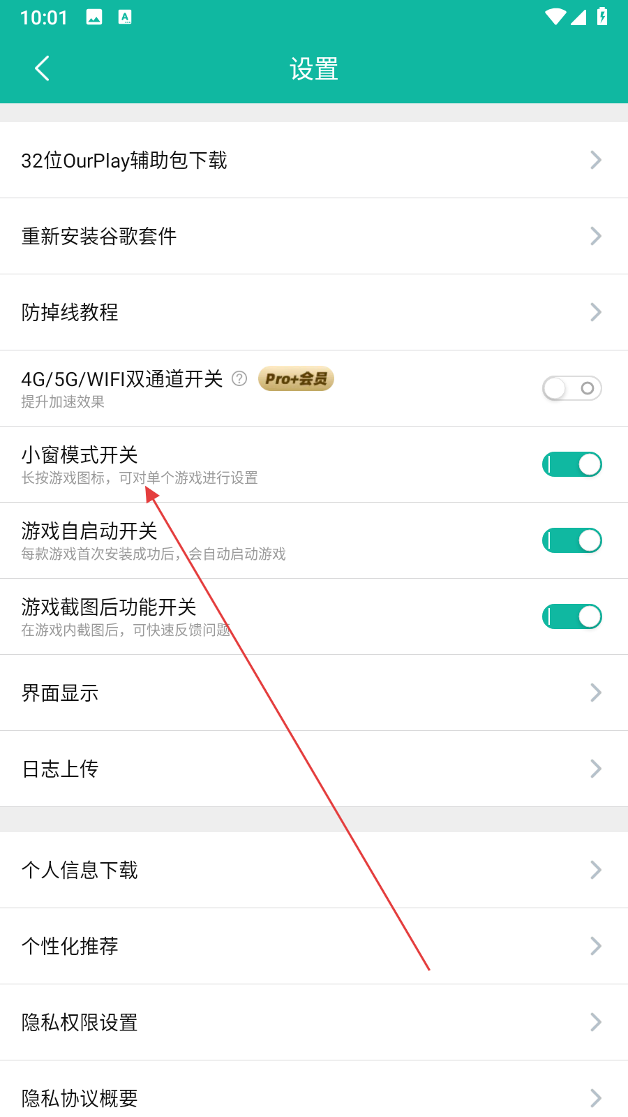 2、在設(shè)置頁(yè)面中找到小窗模式開關(guān)選項(xiàng),點(diǎn)擊其右側(cè)的開關(guān)按鈕將其開啟。