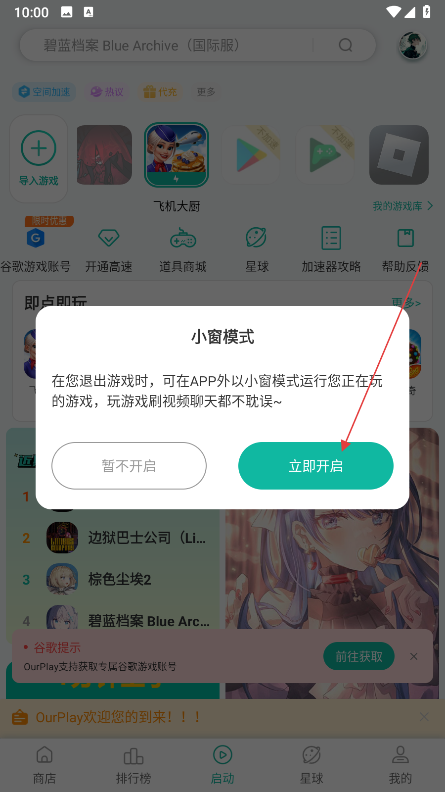 3、回到首頁(yè)長(zhǎng)按游戲圖標(biāo),即可開啟小窗模式,會(huì)彈出小窗模式提示框,點(diǎn)擊提示框中的立即開啟按鈕,即可成功開啟懸浮窗功能。