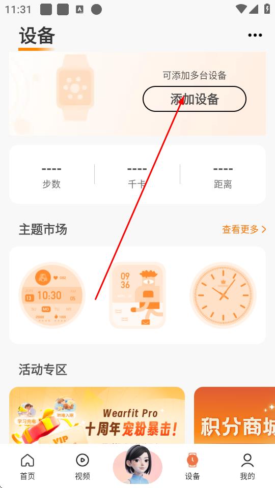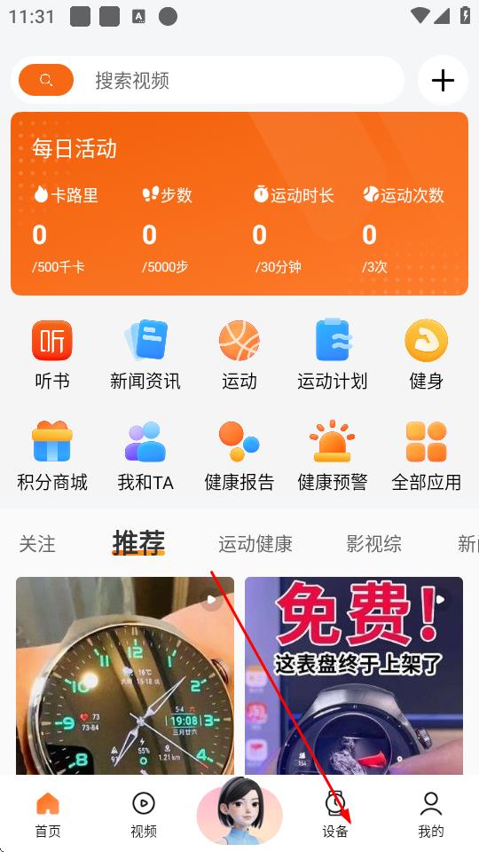 1、打開Wearfitpro應(yīng)用,進(jìn)入首頁(yè),點(diǎn)擊底部導(dǎo)航欄中的設(shè)備選項(xiàng)。