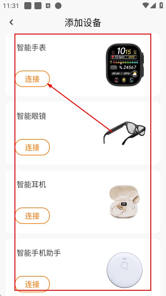 3、進(jìn)入添加設(shè)備頁(yè)面后,選擇你要添加的設(shè)備類型,如智能手表,點(diǎn)擊連接按鈕。