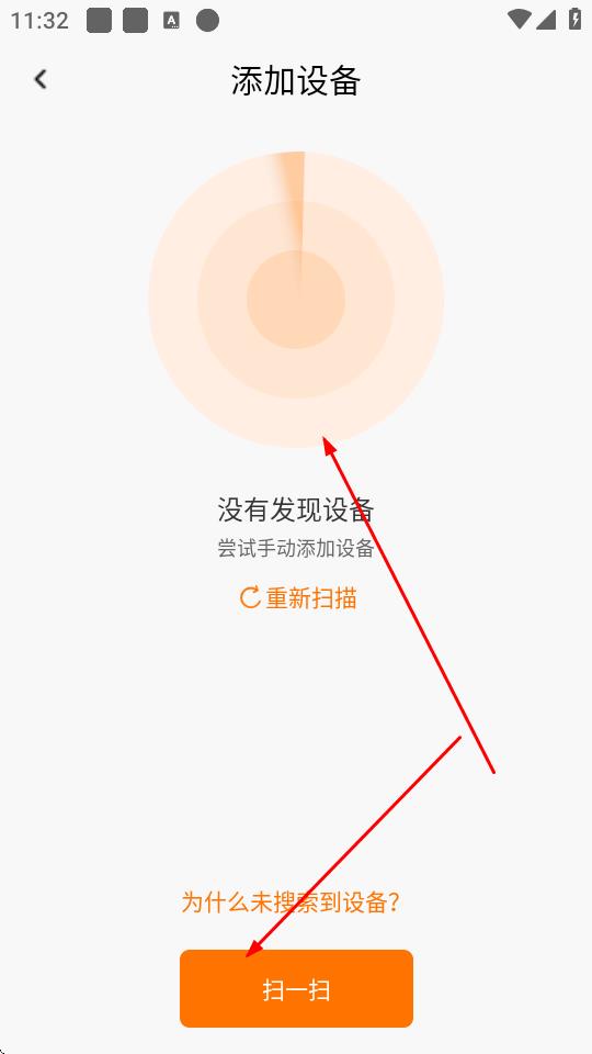 4、如果應(yīng)用沒(méi)有自動(dòng)搜索到設(shè)備,點(diǎn)擊頁(yè)面下方的掃一掃按鈕。