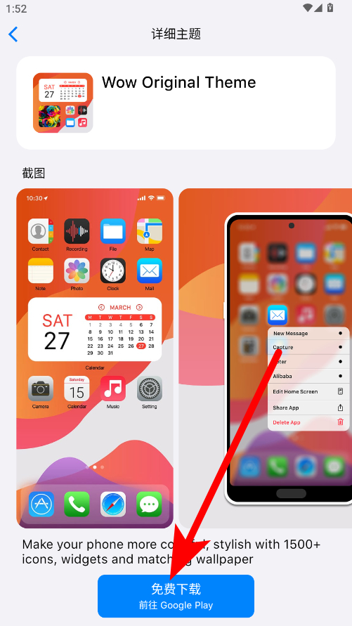 4、在詳細主題頁面,點擊免費下載按鈕,前往Google Play完成下載后進行設置應用。