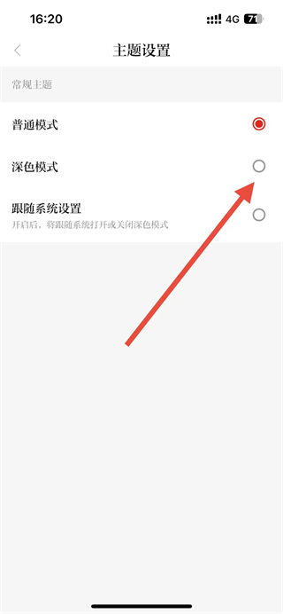 4、在主題設(shè)置頁(yè)面選擇深色模式,即可完成深色主題設(shè)置操作。