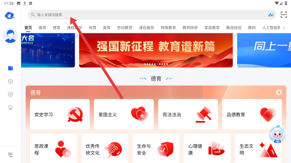 1、在智慧中小學(xué)首頁(yè),可以點(diǎn)擊使用頂部搜索欄,輸入關(guān)鍵詞即可查找所需教育資源,開(kāi)啟精準(zhǔn)搜索流程。