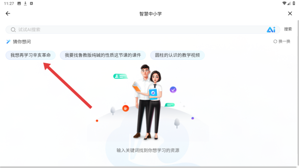 2、進(jìn)入搜索界面,選擇或輸入如我想再學(xué)習(xí)辛亥革命的關(guān)鍵詞,借助AI搜索匹配相關(guān)學(xué)習(xí)資源,縮小查找范圍。