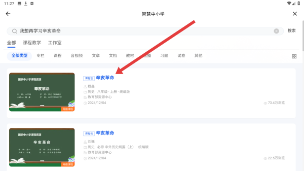 3、在搜索結(jié)果中,點(diǎn)擊標(biāo)有辛亥革命的課程條目,進(jìn)入詳情頁(yè),查看課程內(nèi)容、適用年級(jí)等信息,獲取學(xué)習(xí)資料。