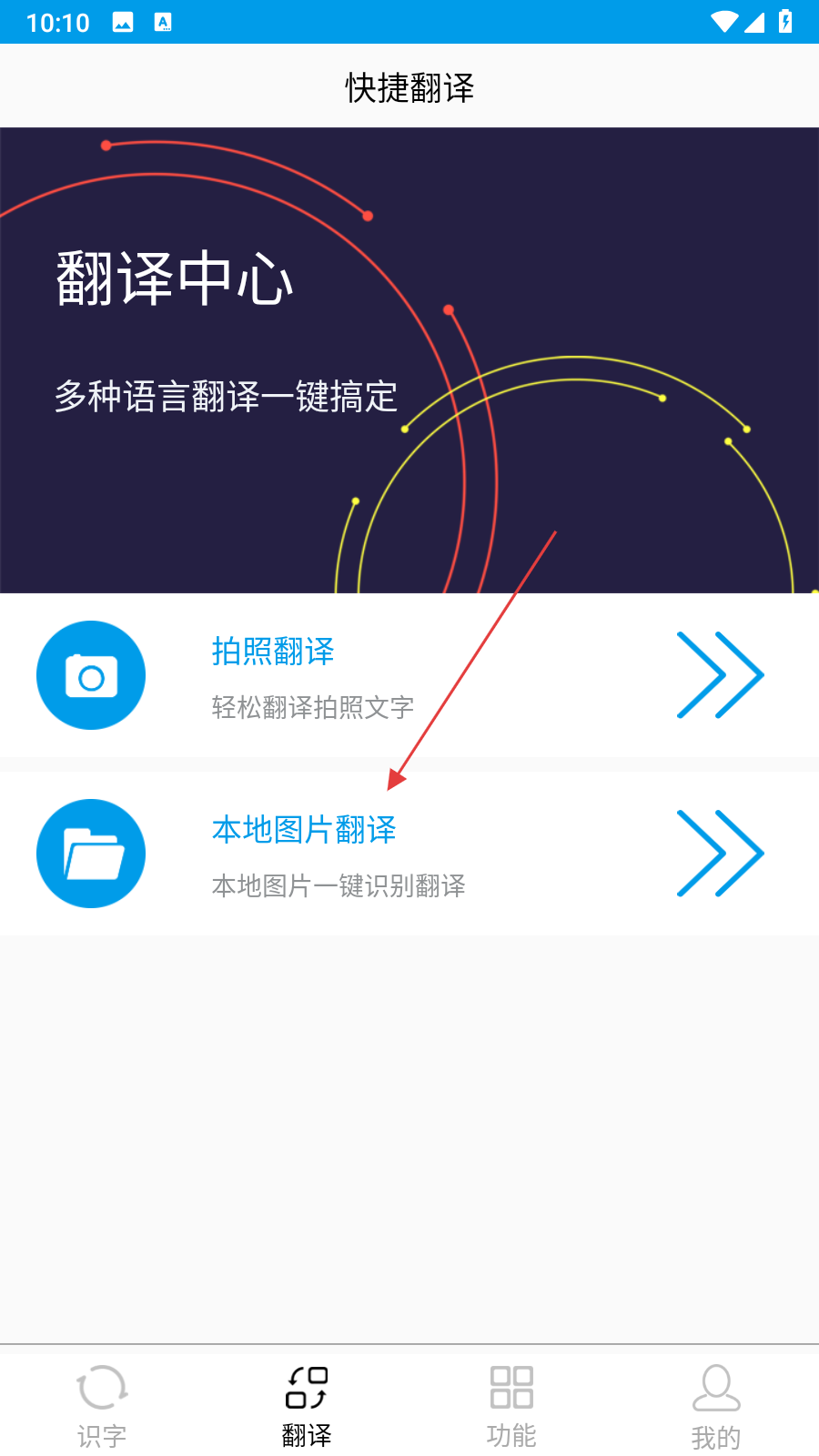 1、打開拍圖辨字大師APP,在快捷翻譯頁面,點擊本地圖片翻譯選項。