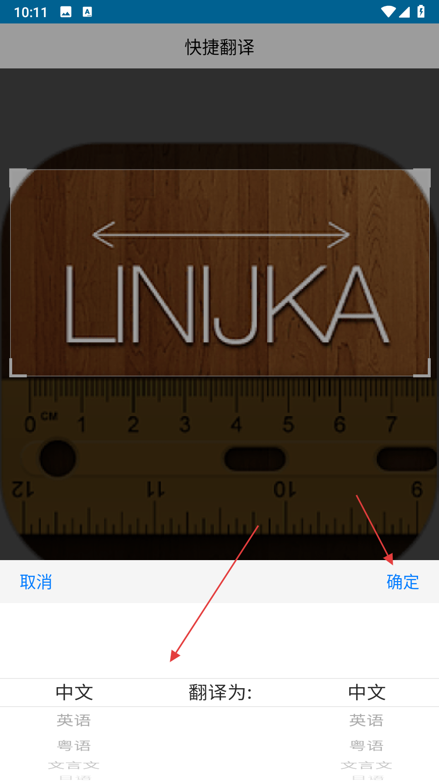 4、在彈出的語言選擇界面,設(shè)置好翻譯的目標(biāo)語言,點擊確定,即可完成本地圖片的翻譯操作,查看翻譯結(jié)果。