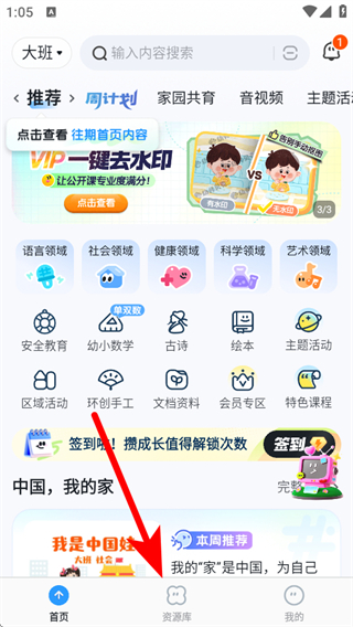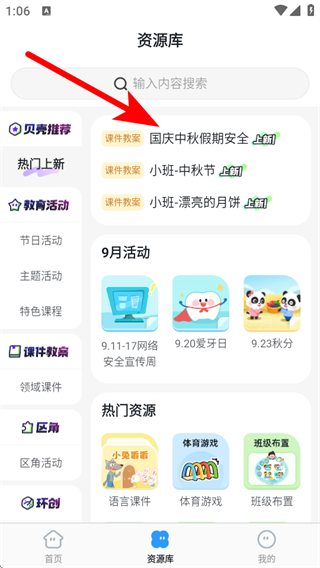 1、在幼師貝殼首頁,點擊底部資源庫,進(jìn)入資源庫的頁面。