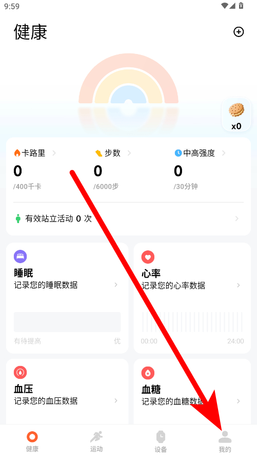 1、在小米運(yùn)動(dòng)健康的健康頁(yè)面,點(diǎn)擊右下角我的選項(xiàng),進(jìn)入個(gè)人頁(yè)面。