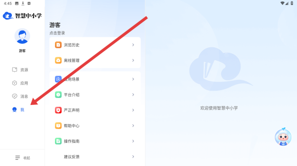 1、在智慧中小學(xué)平臺(tái)界面,點(diǎn)擊左側(cè)導(dǎo)航欄的我,進(jìn)入個(gè)人中心頁面,查看游客狀態(tài)下的功能列表。