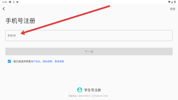 3、在手機(jī)號(hào)注冊(cè)頁面,輸入手機(jī)號(hào)碼,勾選用戶協(xié)議、隱私政策及登錄政策,激活下一步按鈕準(zhǔn)備注冊(cè)。