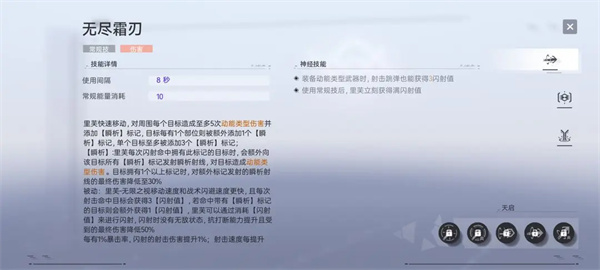 無限里芙核心是閃避射擊(閃射),在人物旁邊會有一個眼睛一樣的圖案,射擊命中即可獲得閃射值,閃射值滿后通過閃避可觸發(fā)閃射攻擊,通過常規(guī)技能-無盡霜刃可以對周圍目標造成傷害的同時添加瞬析標記,射擊命中帶有瞬析標記的敵人會增加額外的閃射值,點亮無盡霜刃神經(jīng)組后即使跳蛋也能獲取三點閃射值并且使用常規(guī)技會獲得滿閃射值。