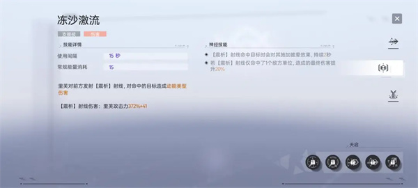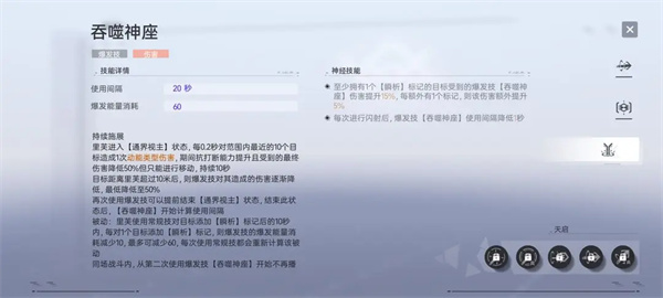 常規(guī)技的瞬析對爆發(fā)技也有不小的作用,每給一個目標添加瞬析標記就可以減少爆發(fā)技需要的10點能量,最多減少60,剛好爆發(fā)技只需要60能量,也就是說只要給6個目標添加瞬析標記就可以0能量使用爆發(fā)技。使用爆發(fā)技會進入轉(zhuǎn)圈圈狀態(tài),轉(zhuǎn)圈圈可以移動,期間每0.2秒對周圍10個目標造成動能傷害,傷害隨目標距離變化,越遠傷害越低,可以再次點擊爆發(fā)技中止技能