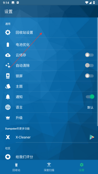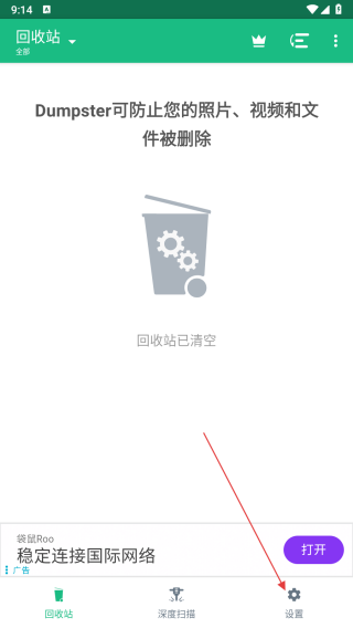 1、打開(kāi)Dumpster應(yīng)用,點(diǎn)擊界面右下角的設(shè)置選項(xiàng),進(jìn)入設(shè)置頁(yè)面。