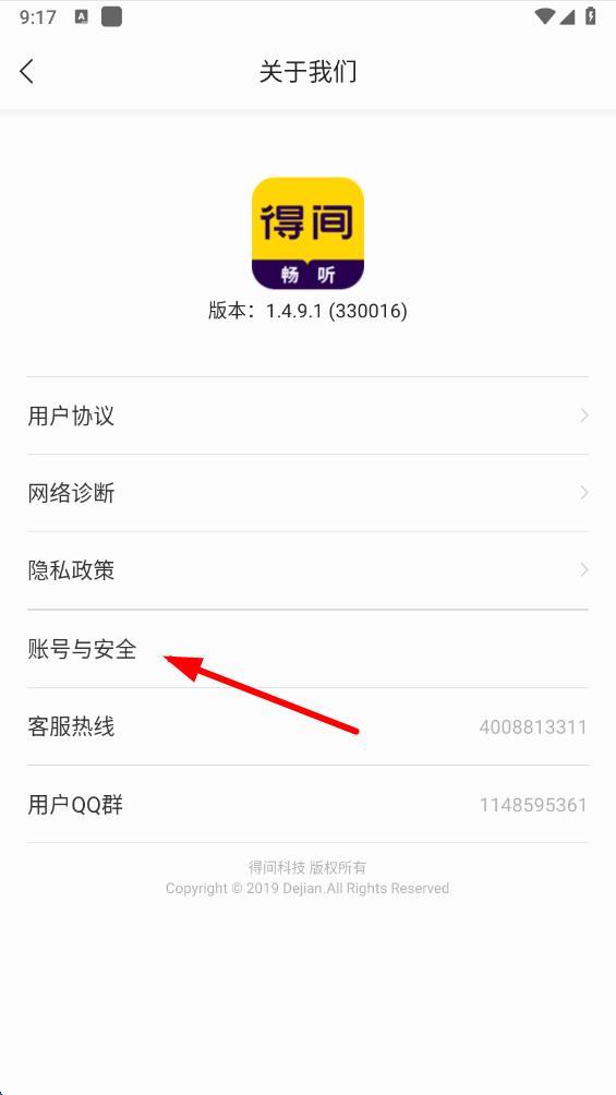 4、在關(guān)于我們頁(yè)面,點(diǎn)擊賬號(hào)與安全進(jìn)入賬號(hào)安全管理頁(yè)面。