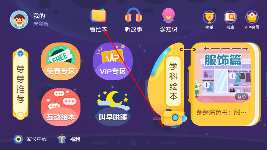 1、打開懶人聽書兒童版App,在主界面點(diǎn)擊看繪本選項(xiàng)。