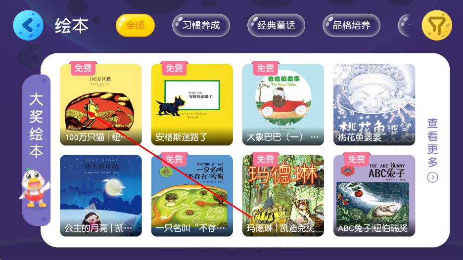 2、進(jìn)入繪本頁面后,瀏覽繪本列表,選擇想要閱讀的繪本,點(diǎn)擊100萬只貓。