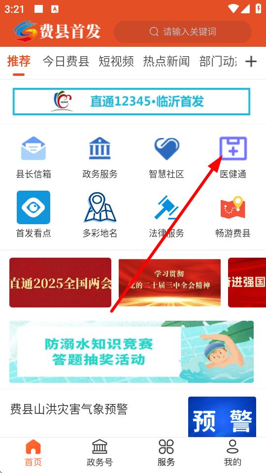 1、打開(kāi)費(fèi)縣首發(fā)app,在首頁(yè)找到并點(diǎn)擊醫(yī)健通選項(xiàng)進(jìn)入相關(guān)頁(yè)面。