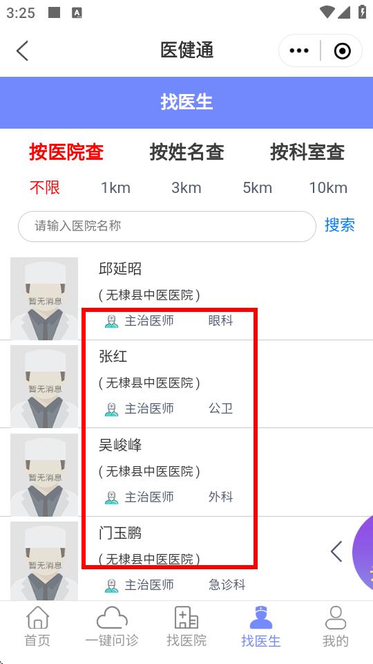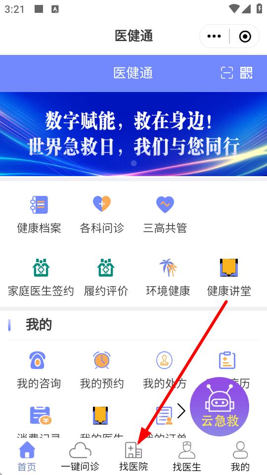 2、進(jìn)入醫(yī)健通頁(yè)面后,點(diǎn)擊底部的找醫(yī)院選項(xiàng)。