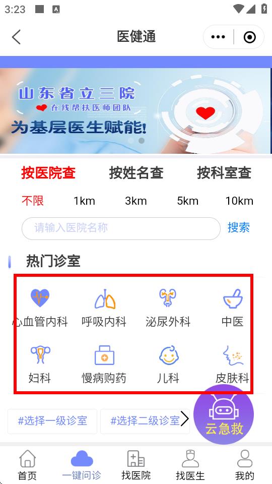 3、在找醫(yī)院頁(yè)面,可看到心血管內(nèi)科、呼吸內(nèi)科等熱門診室分類,選擇所需科室。