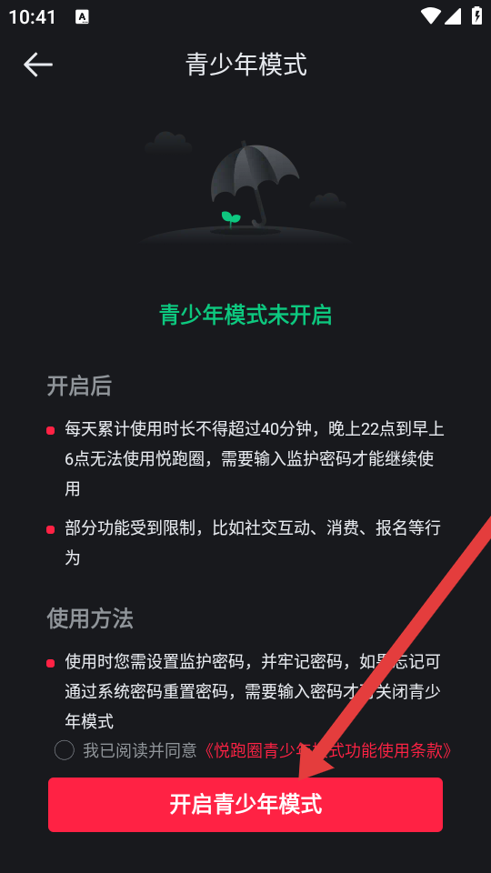 4、在青少年模式頁面點(diǎn)擊開啟青少年模式,按照提示開啟模式。
