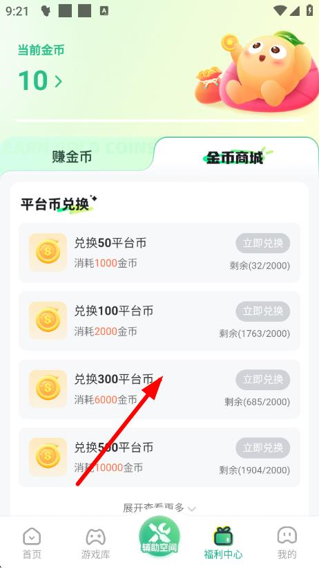 3、在金幣商城的平臺幣兌換欄目下,選擇想要兌換的平臺幣面額,比如兌換300平臺幣,點擊立即兌換,按提示完成兌換。